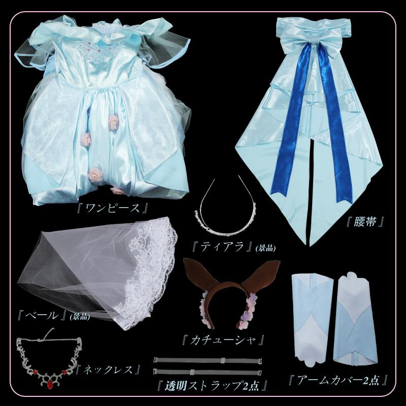 ワンピース、飾り物(カチューシャ、ネックレス、透明ストラップ2点、アームカバー2点、腰帯)