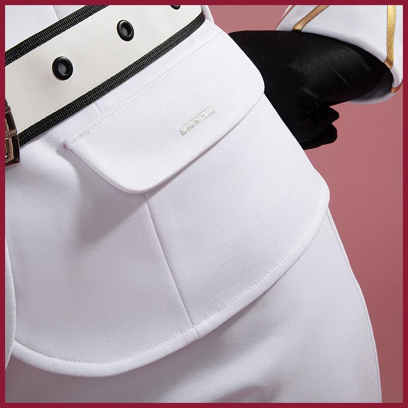 ポリエステルギャバで製作しています。首元のベルトは装飾と固定の役割を兼ね備えます。肩に紐飾りが施されて再現度が高いです。