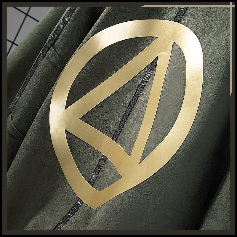 スエード生地で製作しています。フード付きのジャケットで、丈夫な素材を使って実用性が高いです。胸先と右袖に刺繡片を縫い付けてかっこいいです。