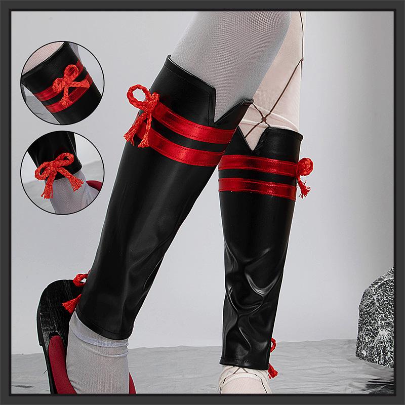 合皮で製作しています。赤と黒を組み合わせて、フィット性に優れたデザインです。後ろにチャックがついて、脱着が便利です。