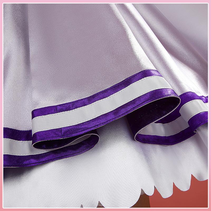 サテンで製作しています。紫を基調として、白い縁取りが施されて、詰め襟のデザインで原作を忠実に再現しました。