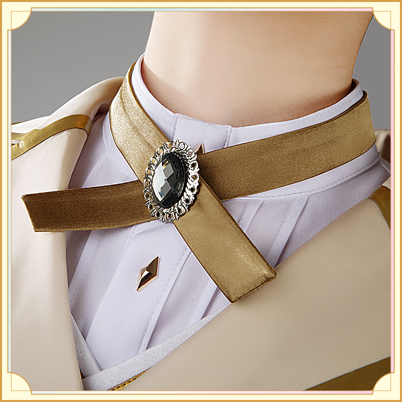 ウォールサテンで製作しています。白を基調とした燕尾服です。襟と袖口に金色の合皮で縁取りされていて華麗です。