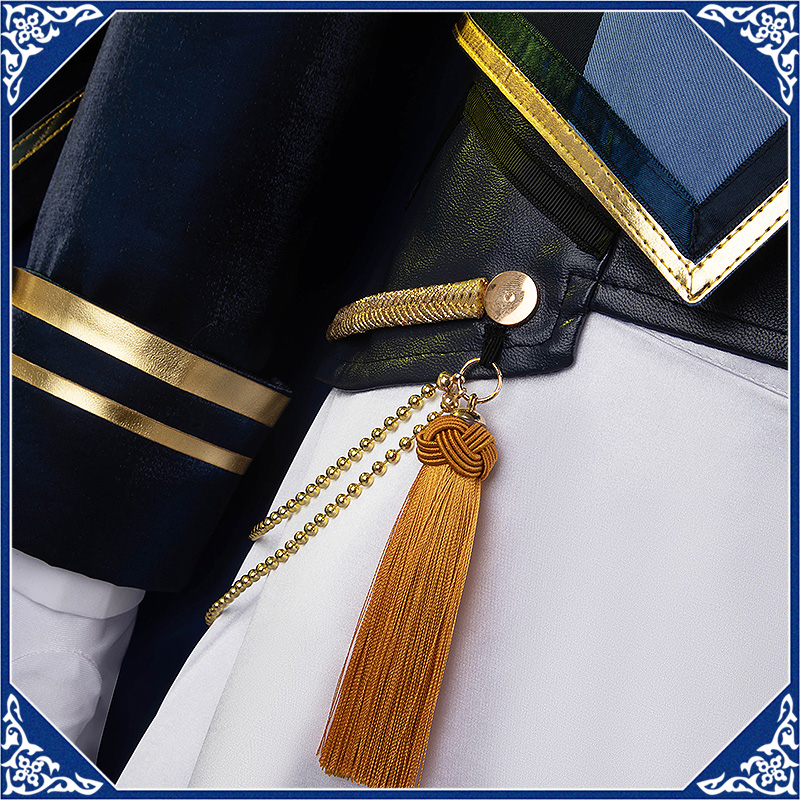 光沢布で製作しています。マント付きの上着で、原作のユニークなデザインを完璧に再現しました。襟と袖口に金色の合皮で縁取りされて華やかです。
