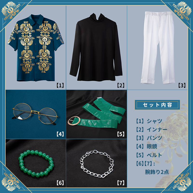シャツ、インナー、パンツ、飾り物(眼鏡、ベルト、腕飾り2点)