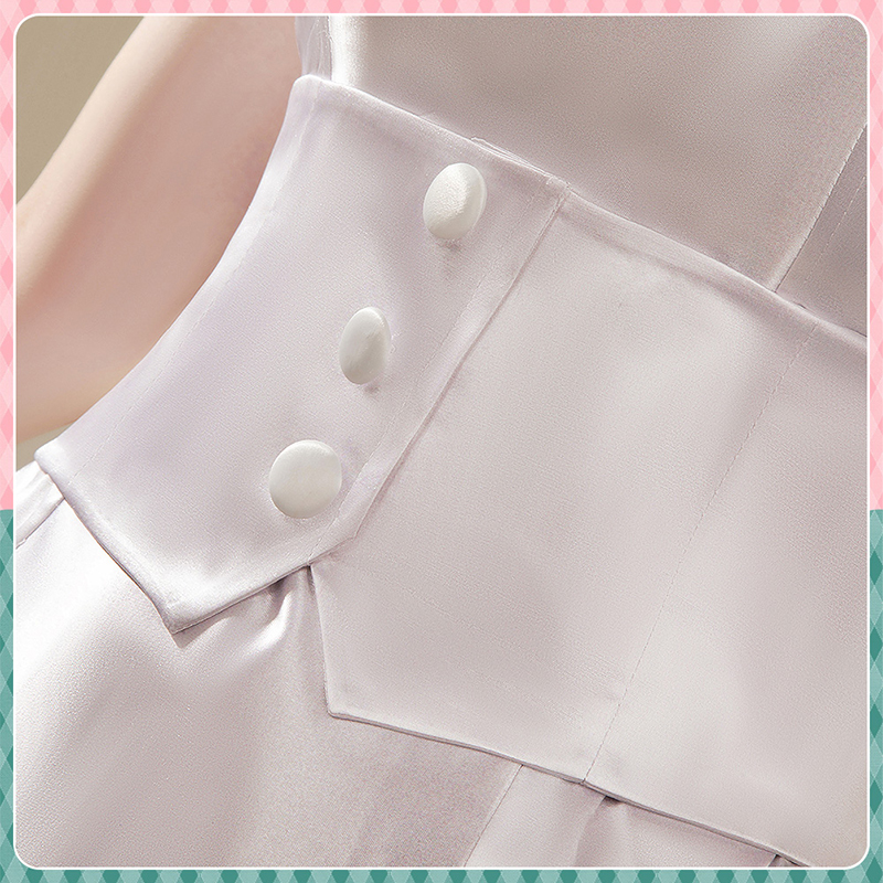 サテンで製作しています。色調が柔らかく、シンプルで上品なデザインのワンピースです。滑らかな生地に精巧な模様が施され、美しいシルエットが華やかさを引き立てます。
