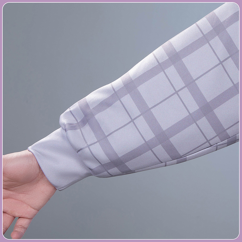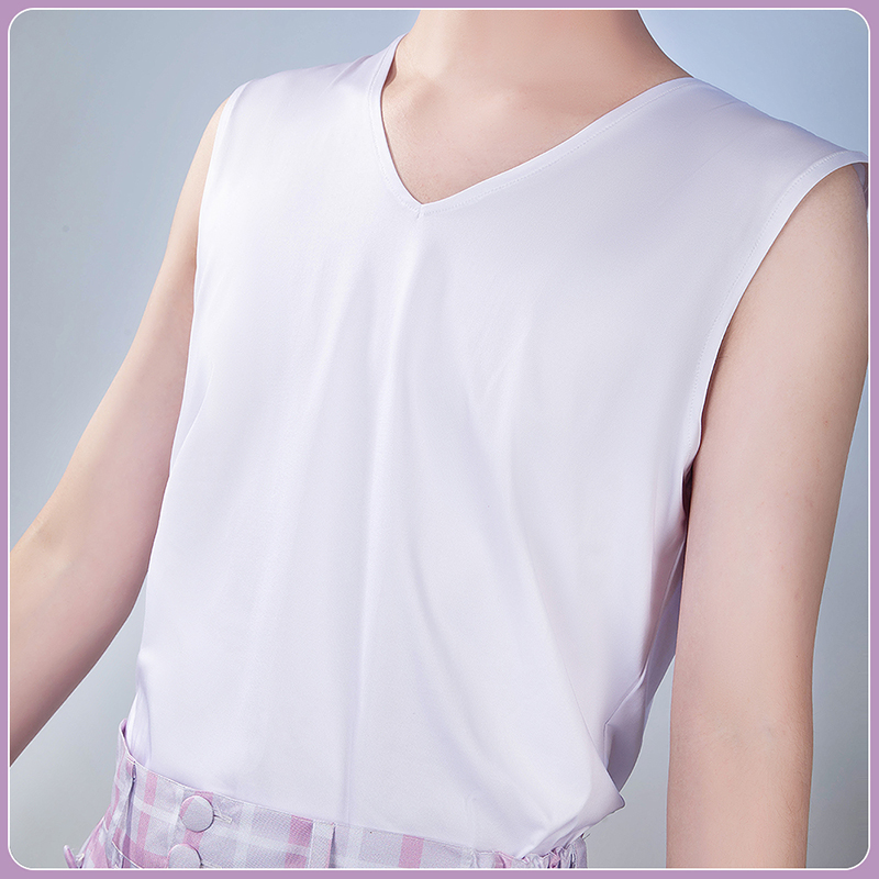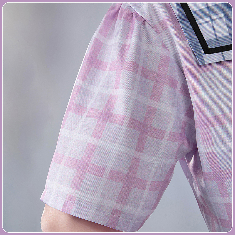 ポリエステルギャバで製作しています。セーラーカラーが甘さを引き立てるピンク白チェック柄のトップスで、可愛らしさを表現。