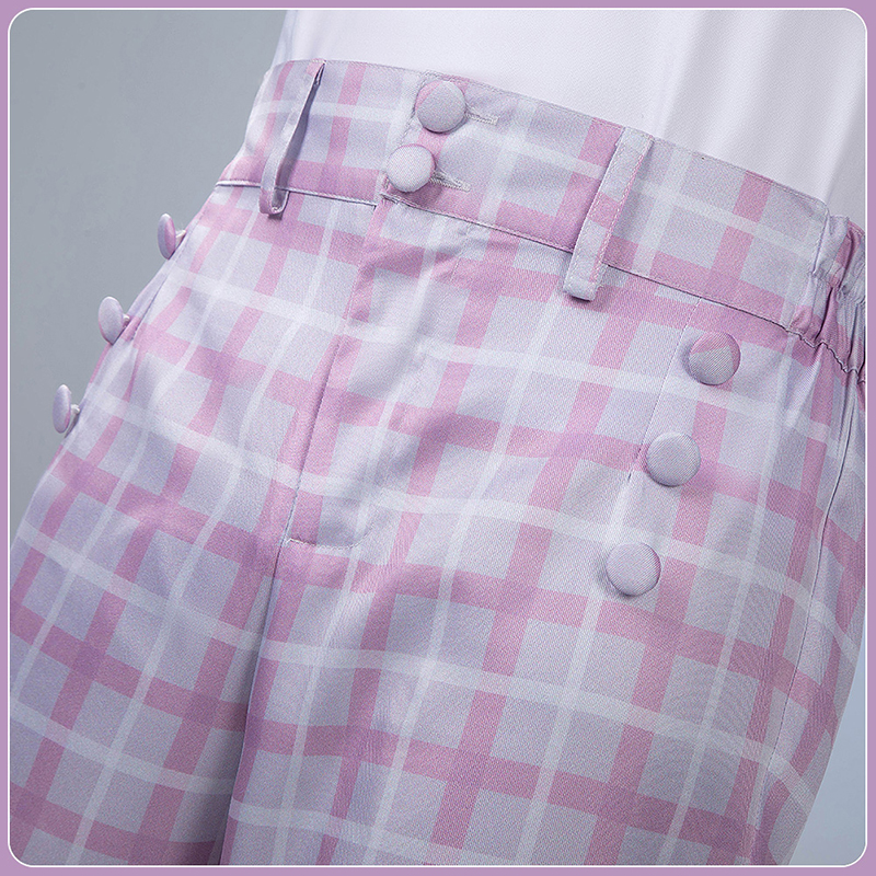 ポリエステルギャバで製作しています。心地よいピンクと白のチェック柄パンツ。リラックスフィットで長時間の着用でも快適。