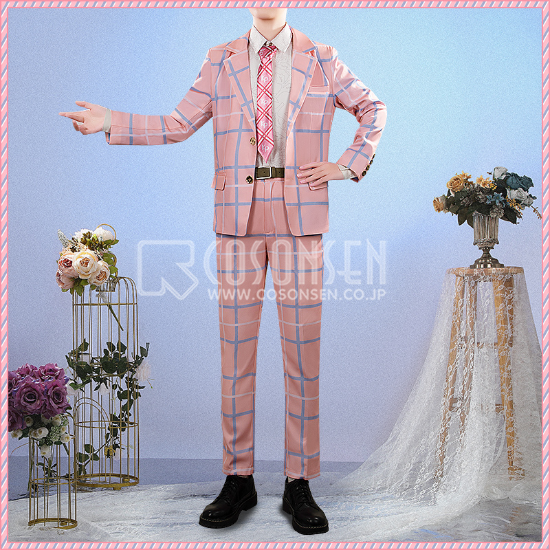 ポリエステルで製作しています。ピンクを基調としたチェック柄のテーラードジャケットで、シングルブレストの2つボタン仕様で、襟はノッチドラペル、袖口にはボタン付きのカフス、胸ポケットとフラップ付きの腰ポケットが付いています。