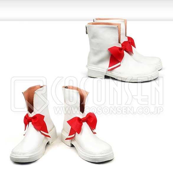 全体は白い合皮生地で作成しました。正面には赤くてきれいな蝶結びがついております。蝶結びはポリ混紡生地を利用しました。後ろには白いファスナーがあります。 かわいい靴ですよね。白と赤の組合はいつも青春感が一ぱいですよ!それに、全部のデザインは原作のように設計しました。買っても損はありません。