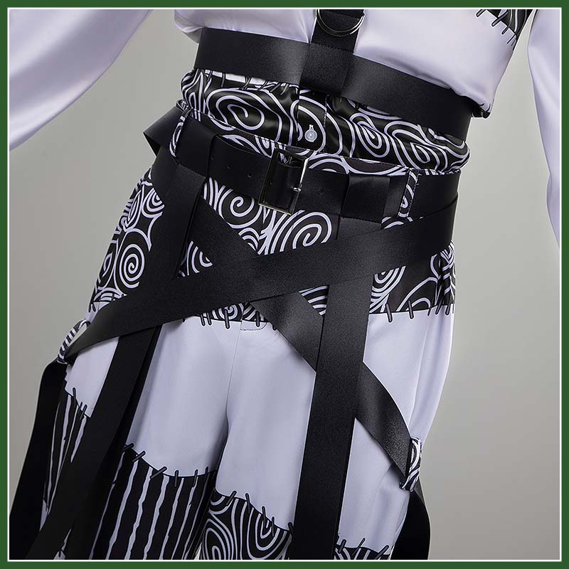 ポリエステルで製作しています。黒と白のコントラストが強いパターン設計で、上部に渦巻き模様、中程に横ストライプ、下部に再び渦巻きやステッチラインが配置され、裾は緩やかに絞られ、ブーツとの相性も考慮されたシルエットです。