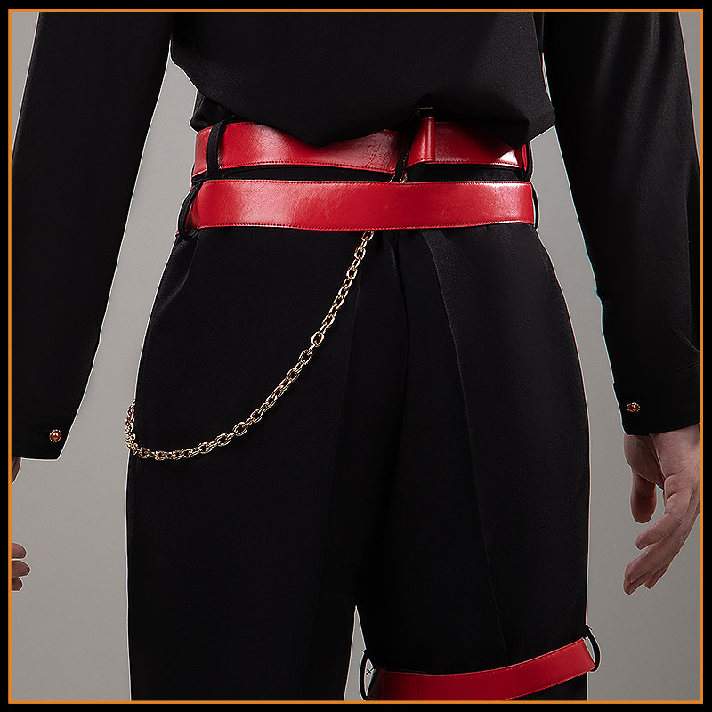 TRサージ生地で製作しています。ウエストにはレッドレザーのダブルベルトを重ね、ゴールドバックルとチェーンでアクセントを加えています。レッドのレッグガーターとチェーンを配し、全体の統一感を高めつつミリタリー&ゴシックな雰囲気を強調。
