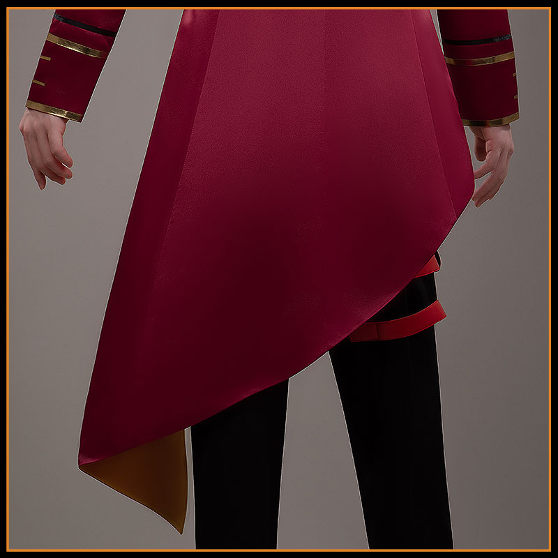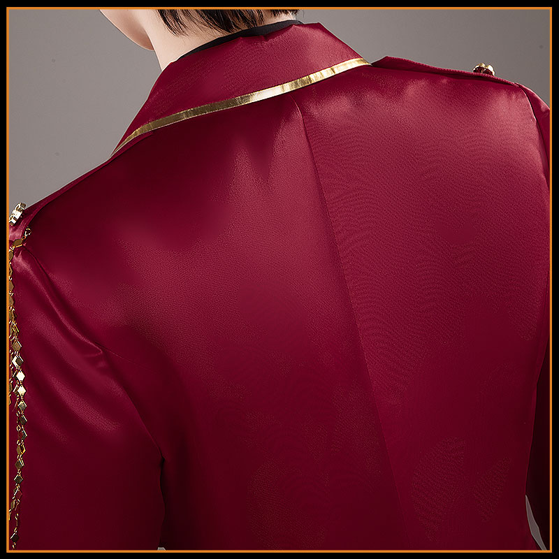 ウェディングサテンで製作しています。フロントはショート丈で大胆にカットされ、内側のブラックシャツを効果的に見せ、後裾は長く優雅に流れるシルエットが特徴です。ダブルブレストの前立てには金色のローズ型ボタンが整然と並び、ゴールドのパイピングがシャープな輪郭を強調。