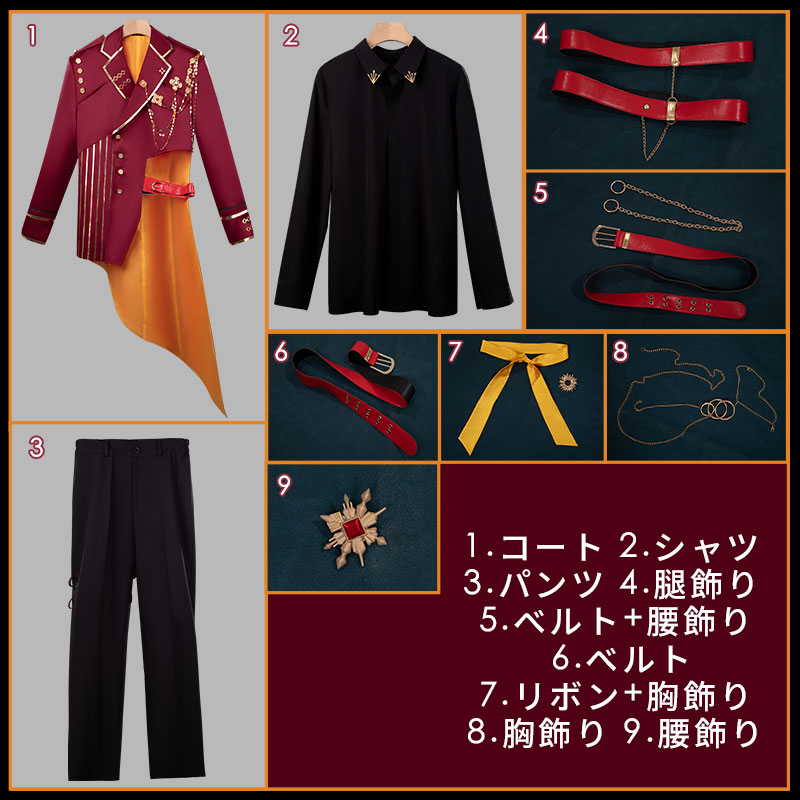コート、シャツ、パンツ、飾り物(腿飾り、ベルト2点、腰飾り2点、リボン、胸飾り2点、)