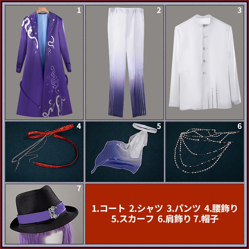 コート、シャツ、パンツ、飾り物(腰飾り、スカーフ、肩飾り、帽子)