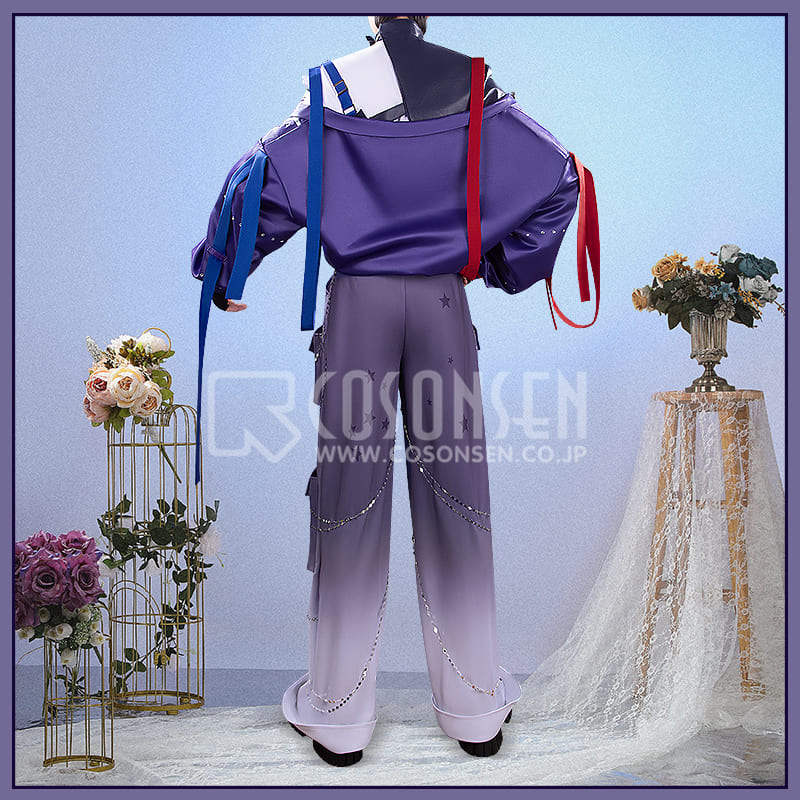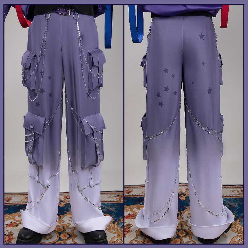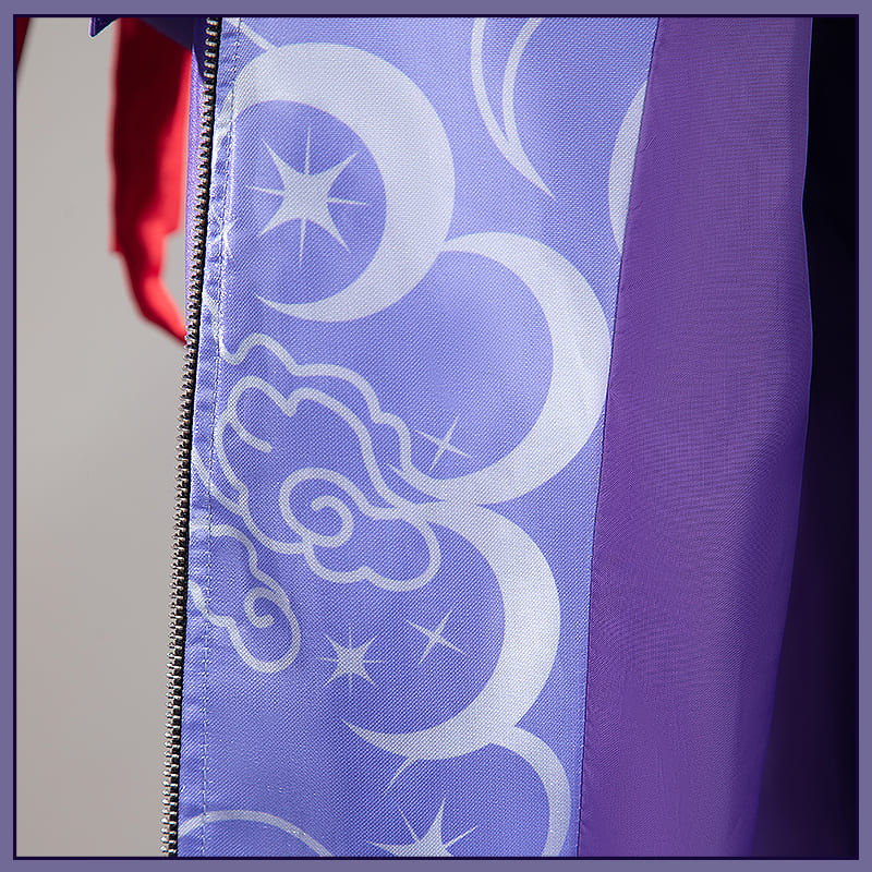 動きやすさとシルエットの美しさを両立。グラデーション加工は、紫から白への自然な色の変化が美しく、独特の存在感を醸し出します。裾部分には星のモチーフを配置し、テーマ性をさらに強調したデザインです。