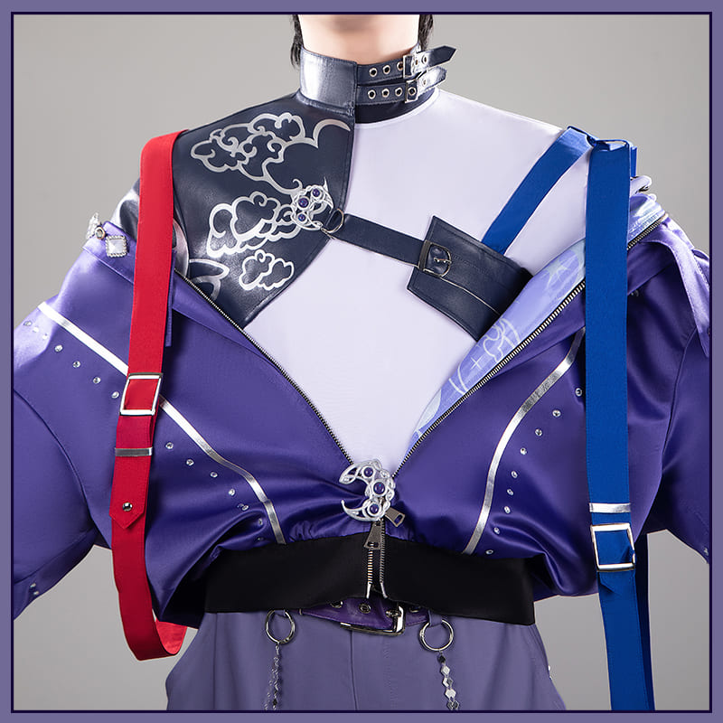 光沢感のあるパープル生地をメインに使用。全体にあしらわれた雲や星の柄はプリントで表現されており、リベットやテープ装飾がアクセントとなっています。メカニカルかつ華やかな印象に仕上げました。