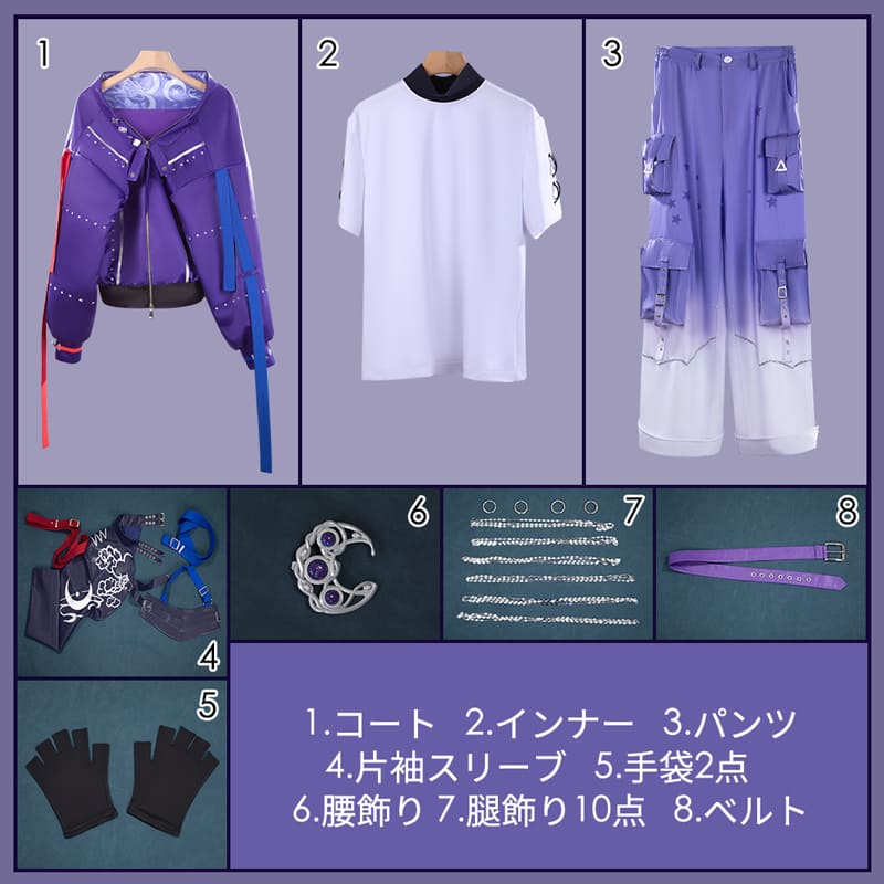 コート、シャツ、パンツ、飾り物(片袖スリーブ、手袋2点、腰飾り、腿飾り10点、ベルト)