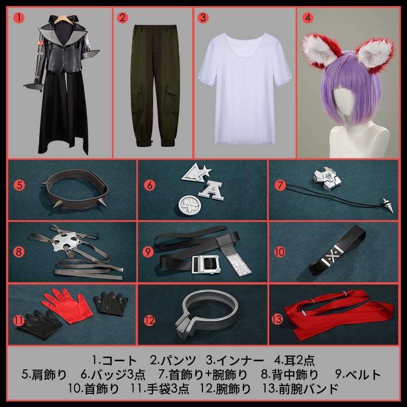 コ一ト、インナー、パンツ、飾り物(耳2点、肩飾り、バッジ3点、首飾り2点、腕飾り、背中飾り、ベルト、手袋3点、腕飾り、前腕バンド))