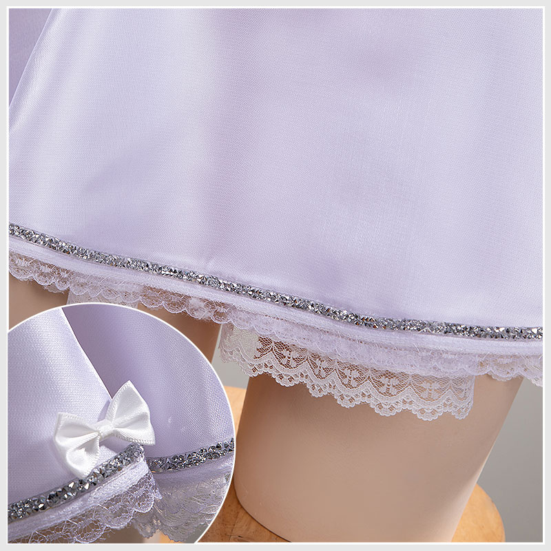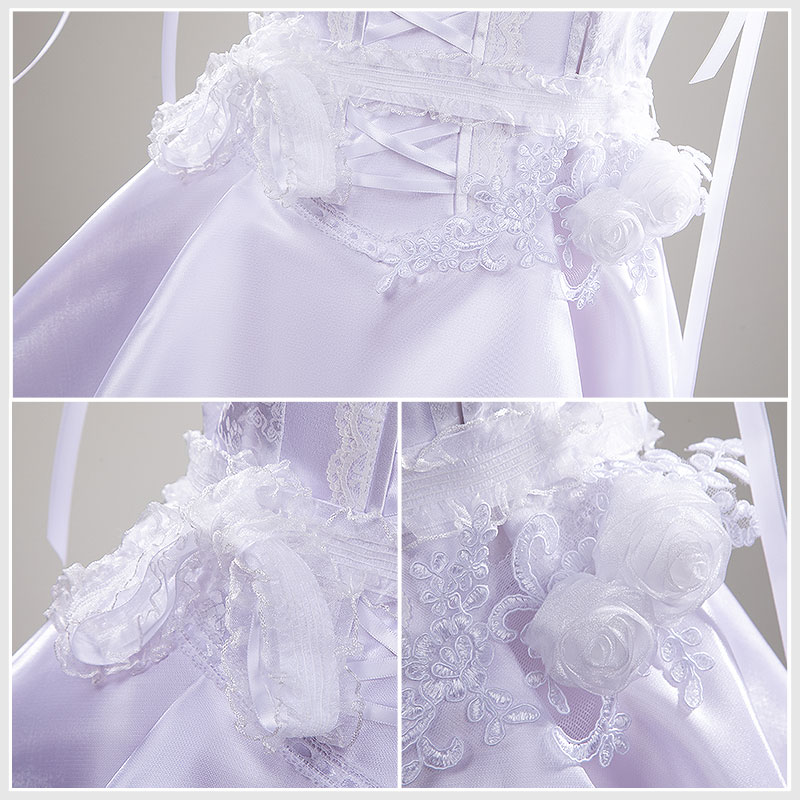 オーガンザ+光沢サテンで製作しています。コルセット風のレースアップデザインで、フロント中央に大きな白いリボンとパールチェーン、両サイドに立体的な薔薇モチーフとレースの装飾が施されています。肩紐も細いリボンが長く伸び、背中で結ぶことでフィット感を調整できます。