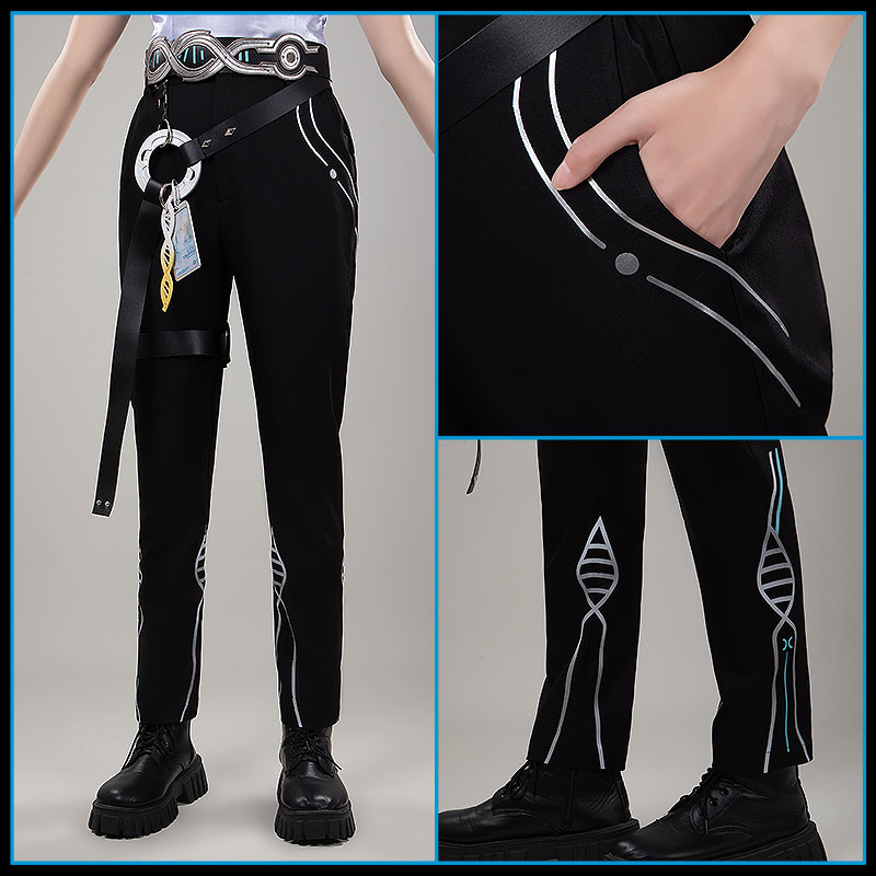 TRサージ生地で製作しています。ブラックのストレートパンツで、シンプルながらもサイドにシルバーの細いラインとDNAヘリックス風の刺繍が施されています。