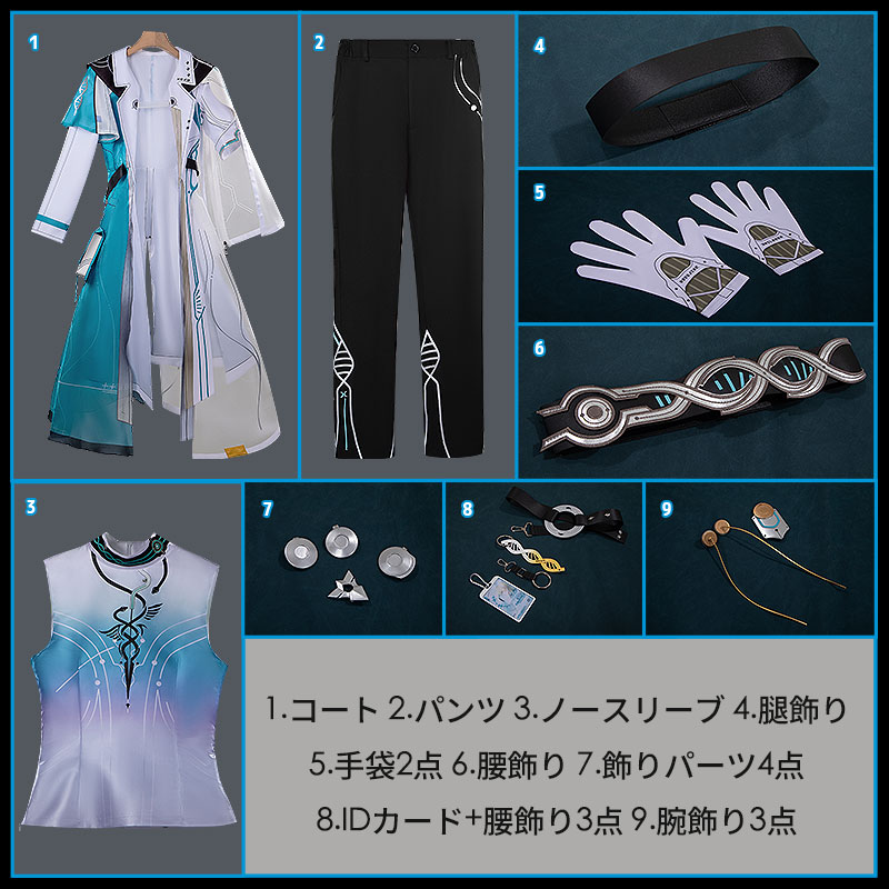 コート、パンツ、ノースリーブ、飾り物(腿飾り、手袋2点、腰飾り、飾りパーツ4点、IDカード、腰飾り3点、腕飾り3点)