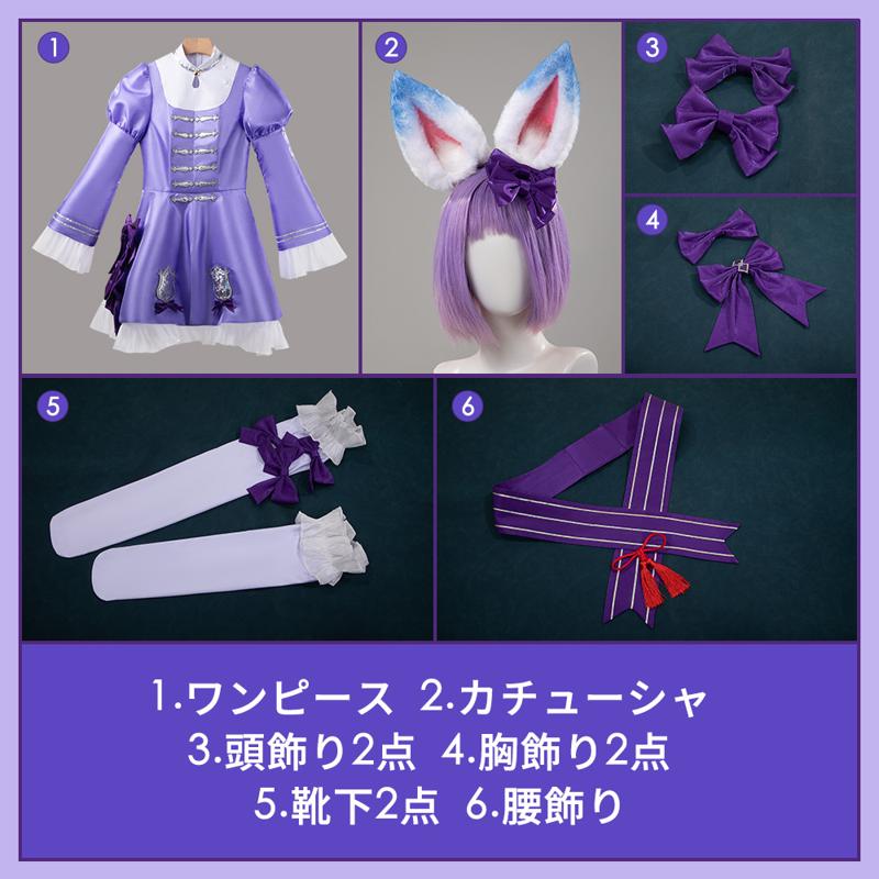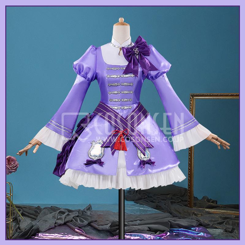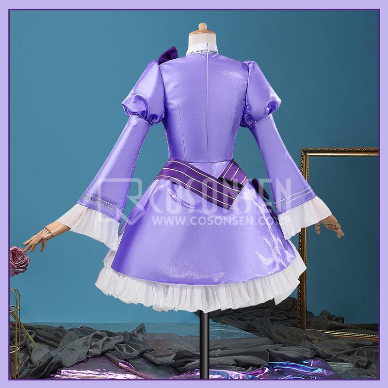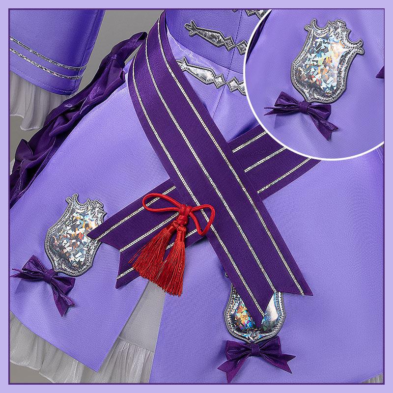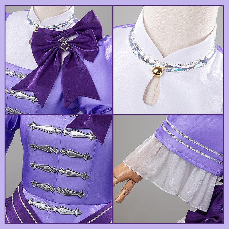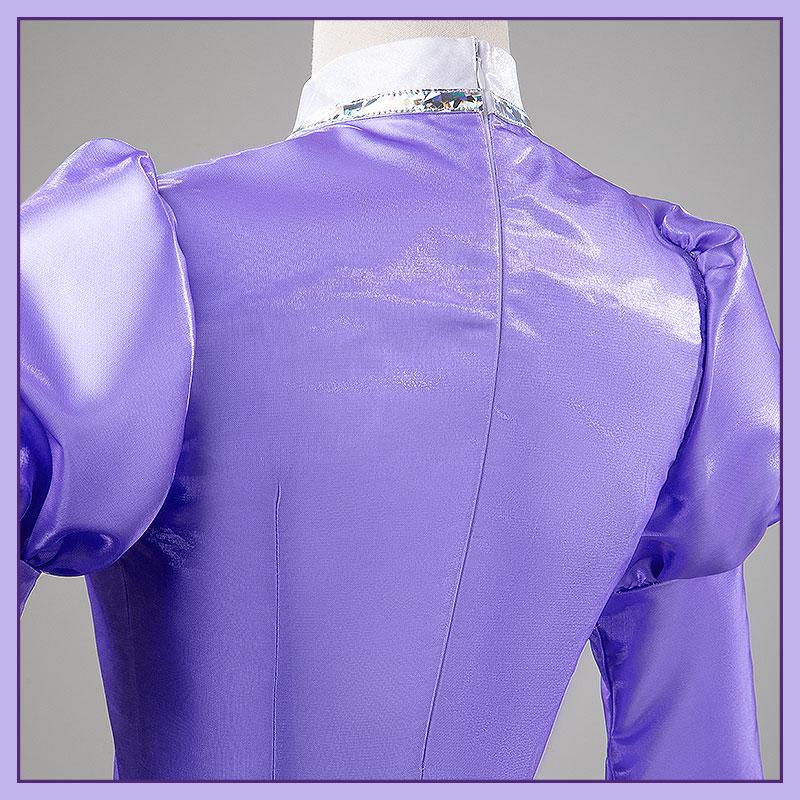 光沢サテンで製作しています。首周りには虹色に輝くホログラフィックトリムと金色のペンダント付きのチョーカーがアクセントとなり、エスト部分には金糸ストライプ入りの紫色ベルトをクロスさせて巻き、裾全体には多層の白いチュールフリルが重なり、軽やかで甘いシルエットを完成させています。