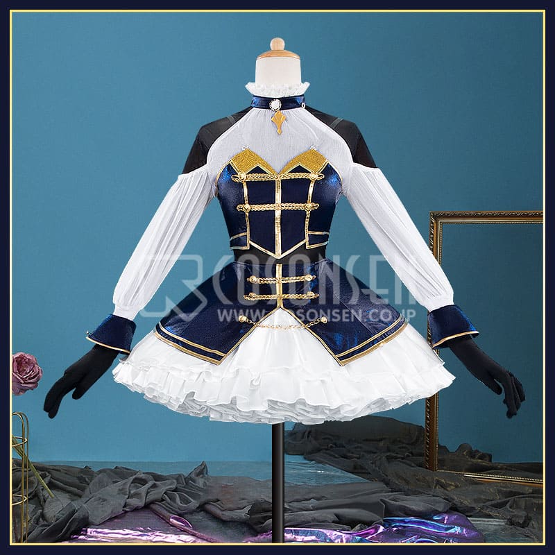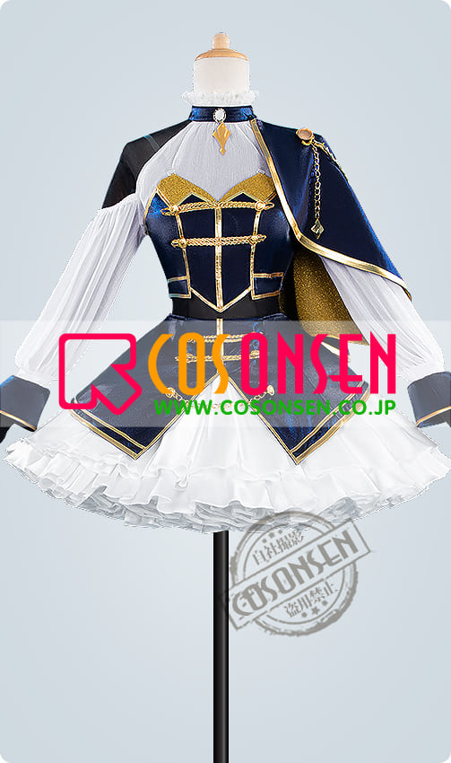 深い紺色のベルベットと純白のシフォン・フリルを基調とし、金色の刺繍や金属装飾をふんだんにあしらった、典雅で華やかな舞台衣装を忠実に再現しています。