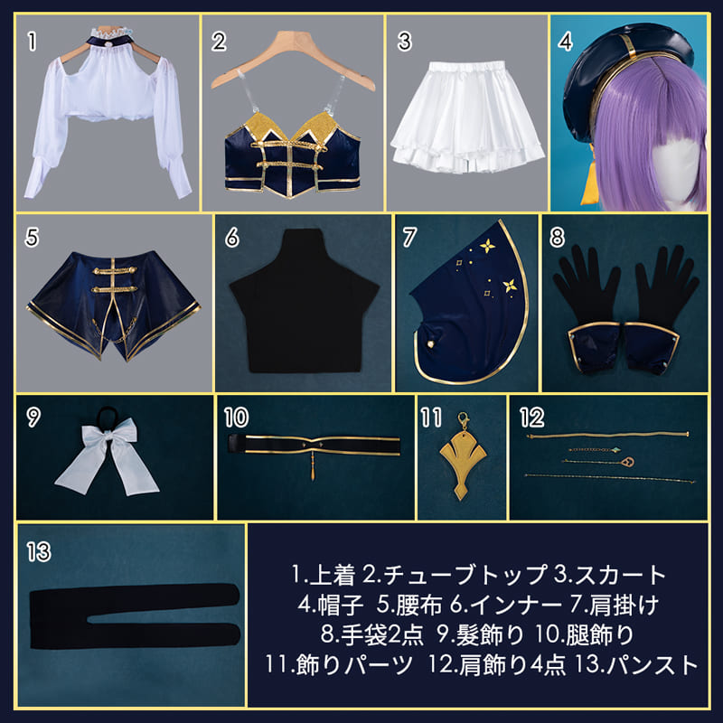 上着、チューブトップ、スカート、インナー、パンスト、飾り物(帽子、腰布、肩掛け、手袋2点、髪飾り、腿飾り、飾りパ一ツ、肩飾り4点)