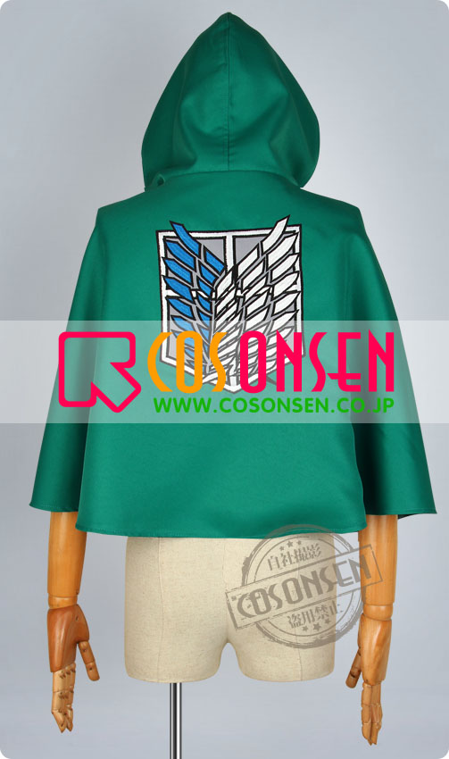 緑を基調したサテン生地で製作します。帽子付き、背中に調査兵団を象徴する模様が刺繍されています。
