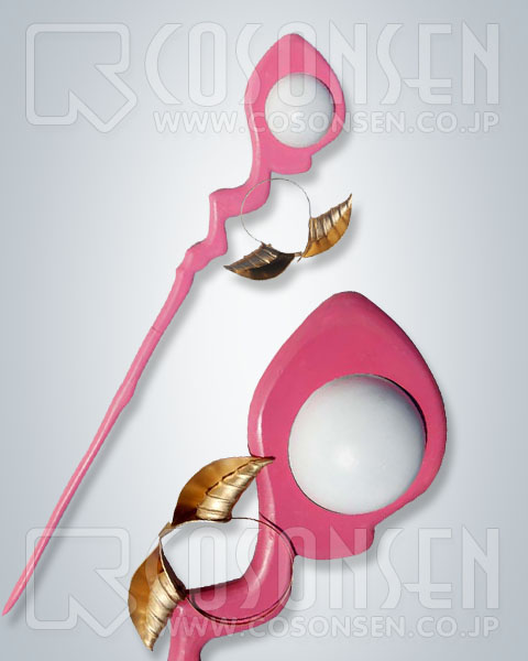 ★魔力を蓄えるホラ貝の形をしている装身具とピンク色の魔導杖です。