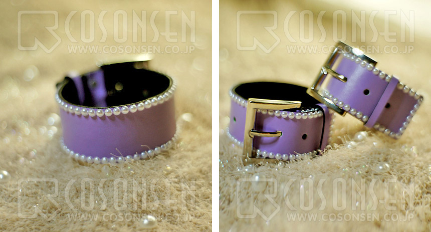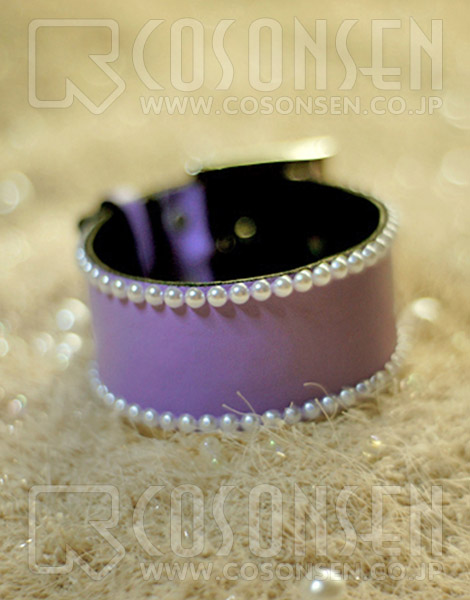★紫の合皮に真珠を丁寧に飾る腕輪です。