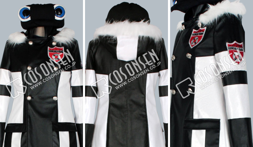 白と黒を基調したポリ混紡生地にで製作。右胸と右腕に勲章をプリントしています。帽子つきで、襟部分はベルベットにで製作。