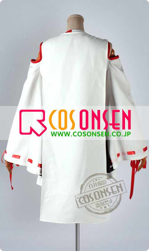 白を基調したポリ混紡生地にて製作します。肩の部位に露出があり、若干着物風です。袖口に赤のサテン帯が飾ります。