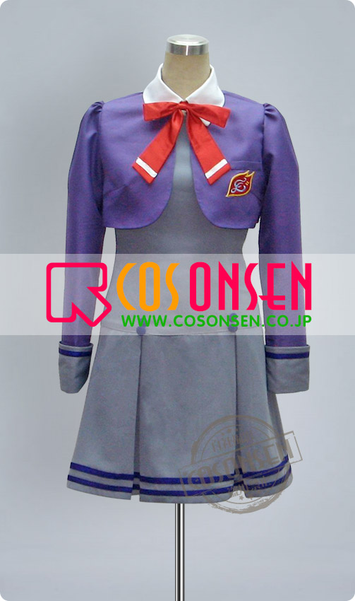 紫を基調したポリ混紡生地にて製作します。袖口はワンピースと同じ灰色です。左胸には校徽があります