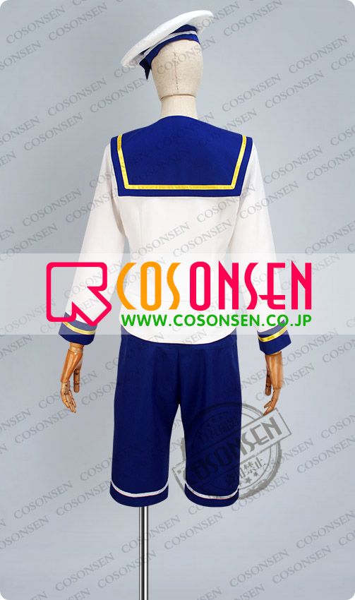青を基調したポリ混紡生地にて製作します。襟元と袖口の金色のラインが原作に充実しております、ボタンで簡単に脱着できます。胸元に本物のポケットがあります。
