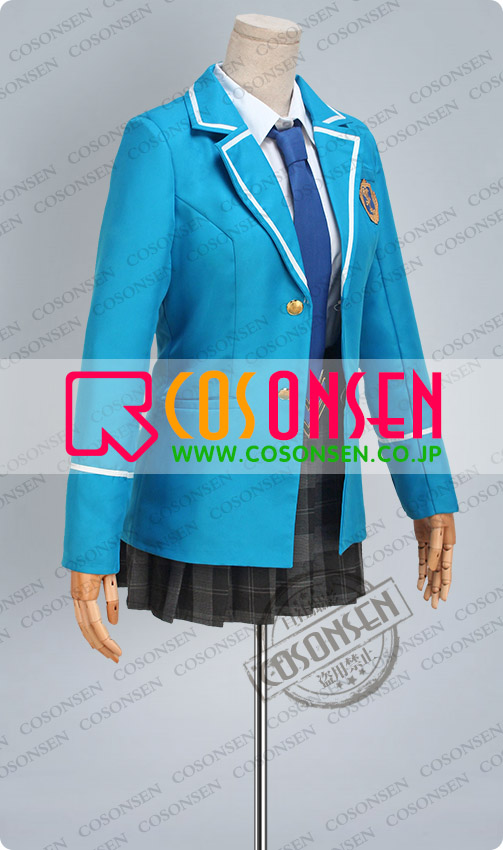 青を基調したポリ混紡生地にて製作します。襟に白いラインが飾って、綺麗です。胸の所に胸章が付き、原作を還元しました。二つのボタンで脱着は簡単にできます。