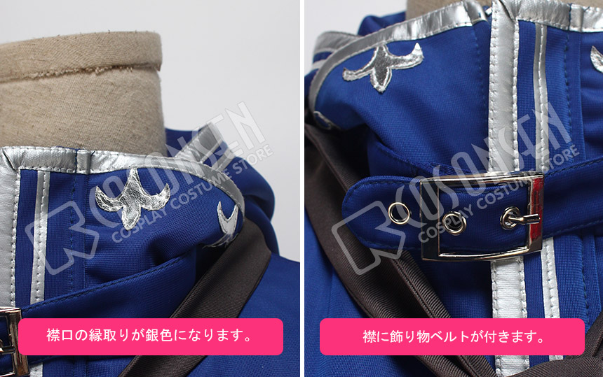 青を基調したポリ混紡生地にて製作します。襟に白いラインが飾って、綺麗です。胸の所に胸章が付き、原作を還元しました。二つのボタンで脱着は簡単にできます。