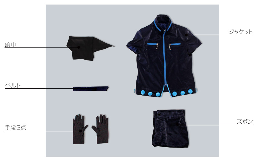 ジャケット、ズボン、飾り物(頭巾、ベルト、手袋2点)