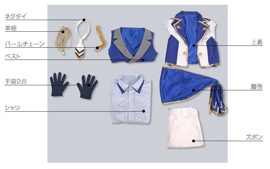 上着、ベスト、シャツ、ズボン、飾り物(ヘッドホン、ネクタイ、パールチェーン、革紐、腰巻、手袋2点)
