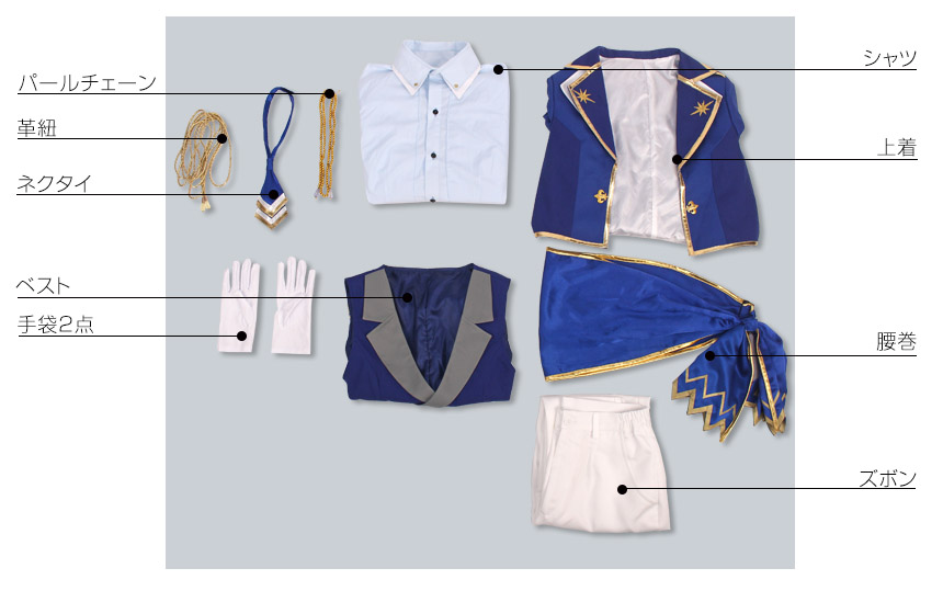 上着、ベスト、シャツ、ズボン、飾り物(ヘッドホン、ネクタイ、パールチェーン、腰巻、革紐、手袋2点)