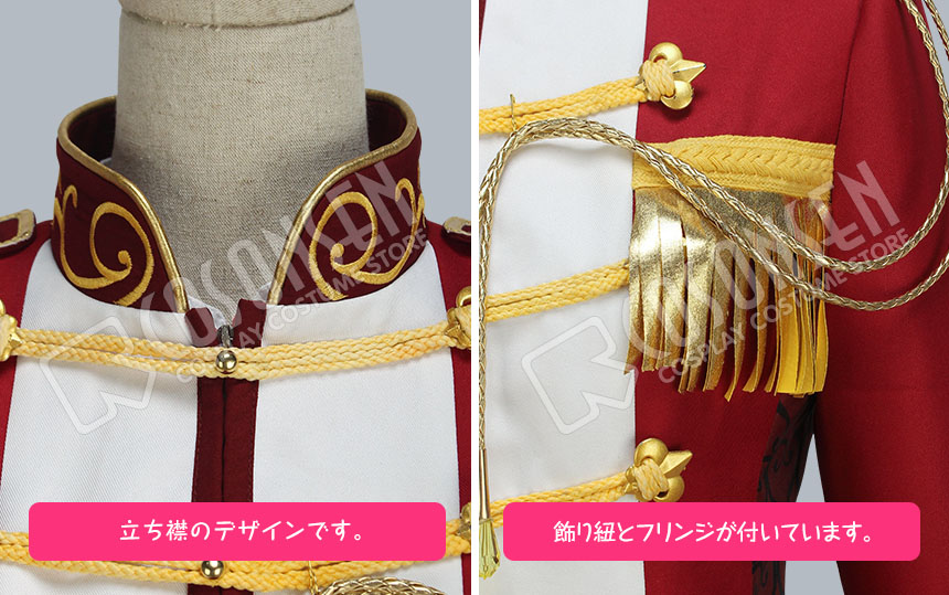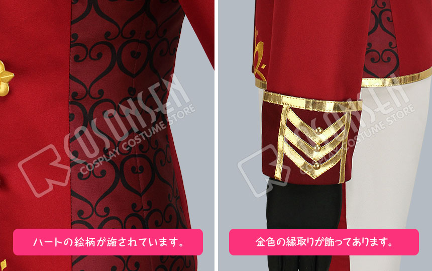ポリ混紡で製作しました。立ち襟のデザインです。正面に金色の紐が飾ってあります。両側にハートの絵柄が施されています。襟と袖口のデザインはよく原作に忠実しています。