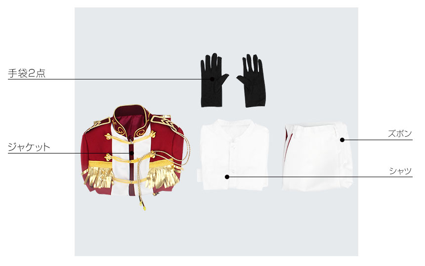 ジャケット、シャツ、ズボン、飾り物(手袋2点、インカム)