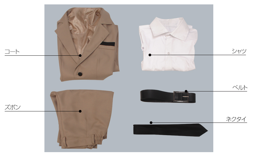 コート、シャツ、ズボン、飾り物(ネクタイ、ベルト)