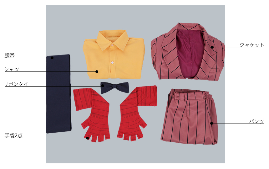ジャケット、シャツ、パンツ、飾り物(リボンタイ、腰帯、手袋2点)