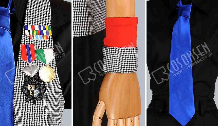 ブルーのネクタイを付きます。そして、灰色と赤の腕飾りも付きます。