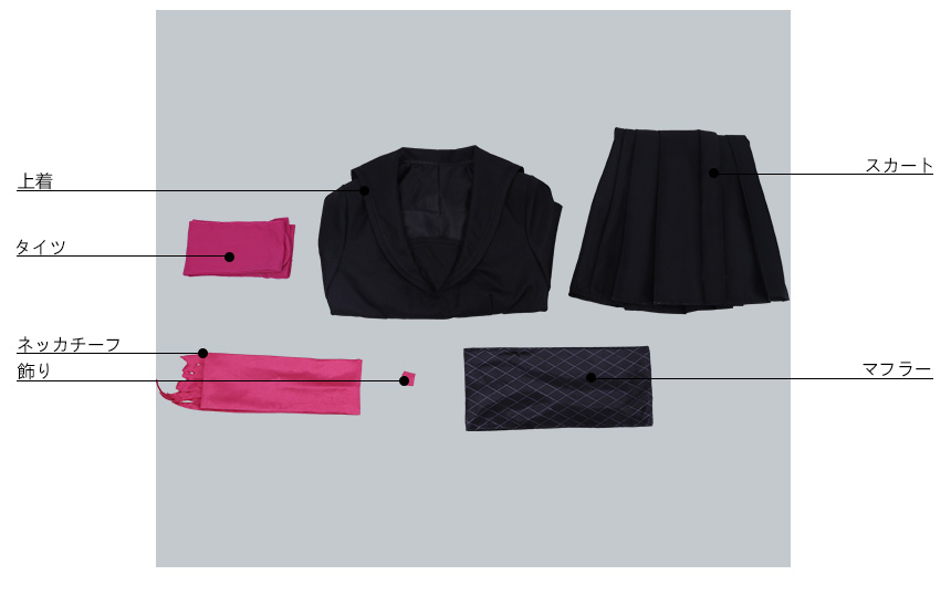 上着、スカート、飾り物(ネッカチーフ、飾り、マフラー、タイツ)